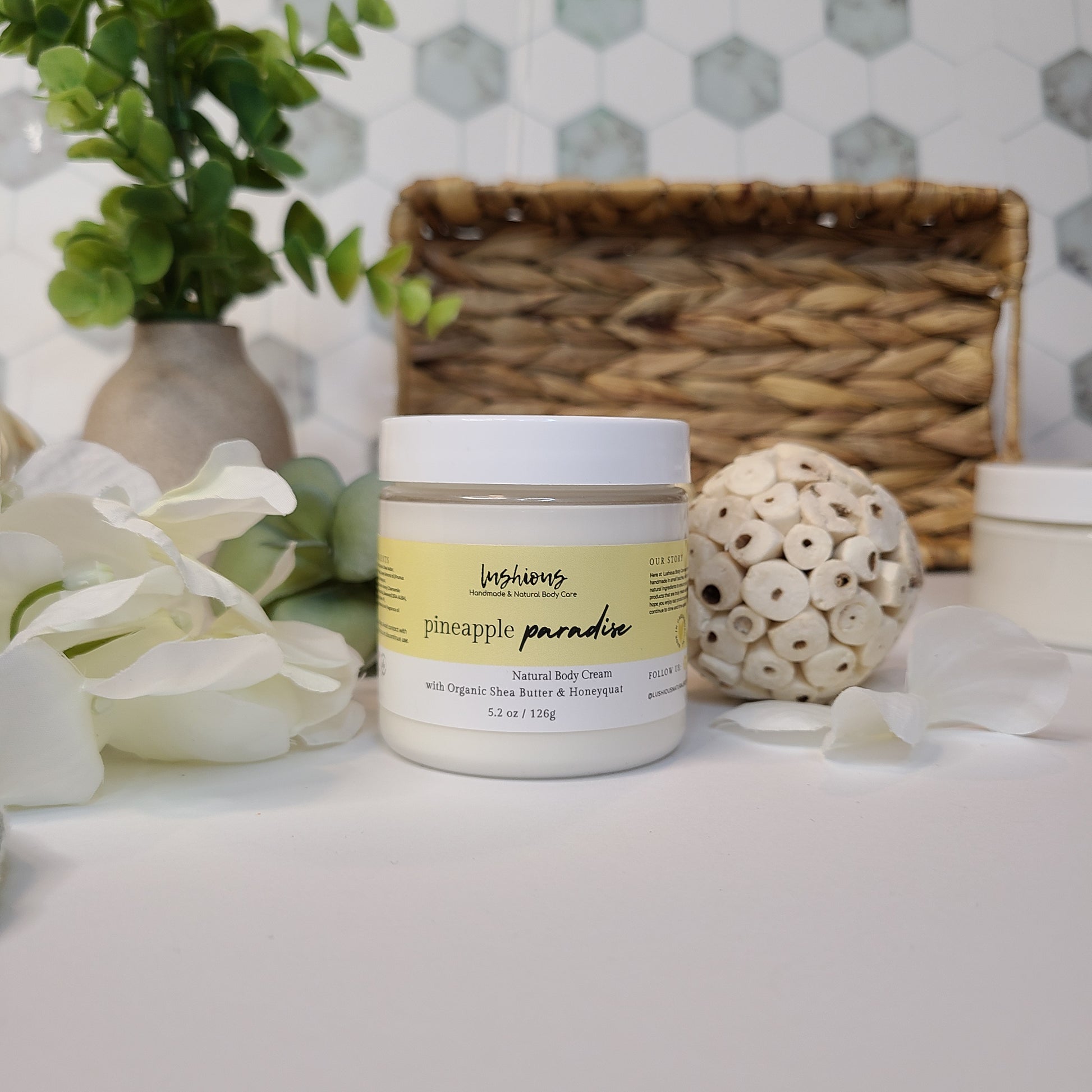 Indulge in the exotic aromas of Pineapple Paradise Body Cream. Savor the zesty flavors of ripe pineapple, crunchy apples, and rich coconuts. Allow this deluxe cream to hydrate your skin as it transports your thoughts to a heavenly oasis.